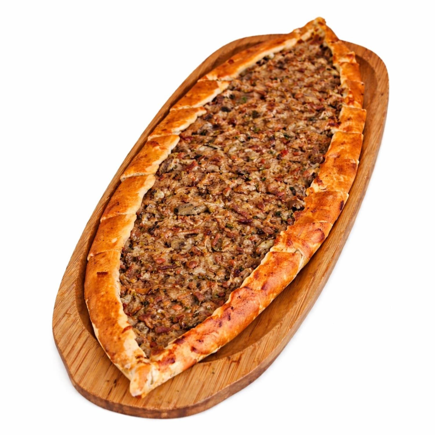 İnce hamur, kıyma, domates, biber, soğan, kaşar peyniri, baharatlar.