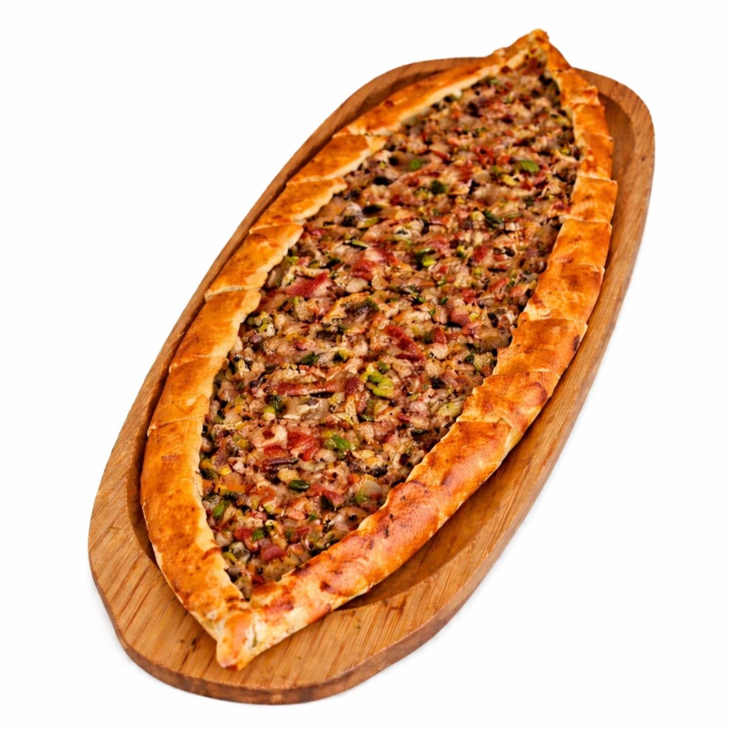Hamur, kuşbaşı dana eti, kıyma, sucuk, kaşar peyniri, domates, yeşil biber, tereyağı.